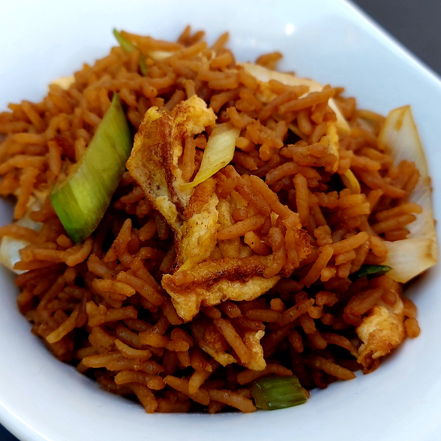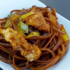 Bami goreng, fried noodles with sweet soy sauce and omelet