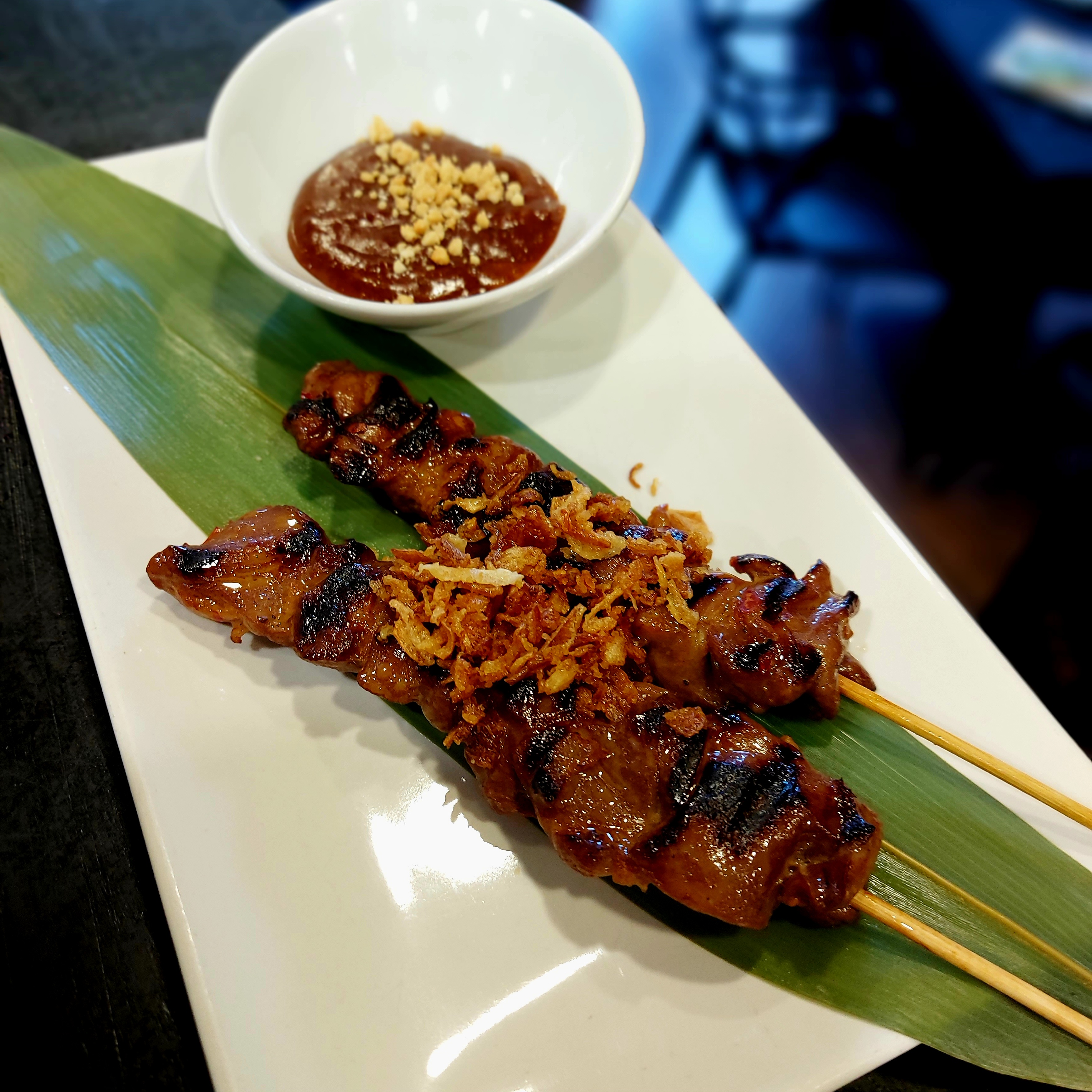 Chicken saté, marinated and grilled chicken skewer served with peanut sauce