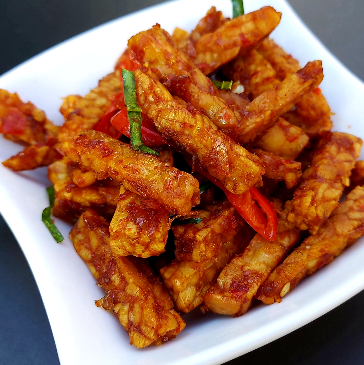 Tempeh manis, fried soy bean cake with chilis, kaffir lime leaves, palm sugar and sweet soy sauce
