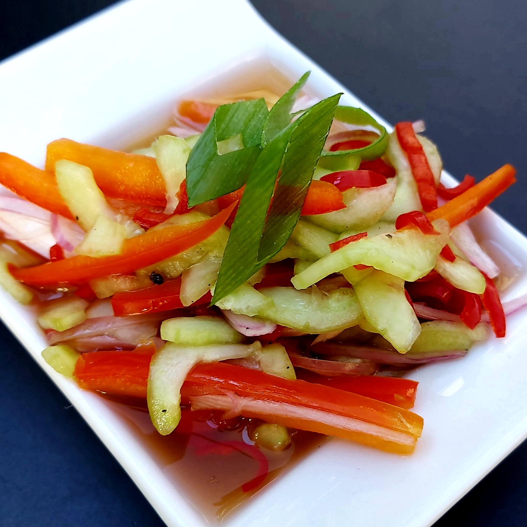 Atjar ketimun, sweet and sour cucumber salad, with red bell pepper and shalots